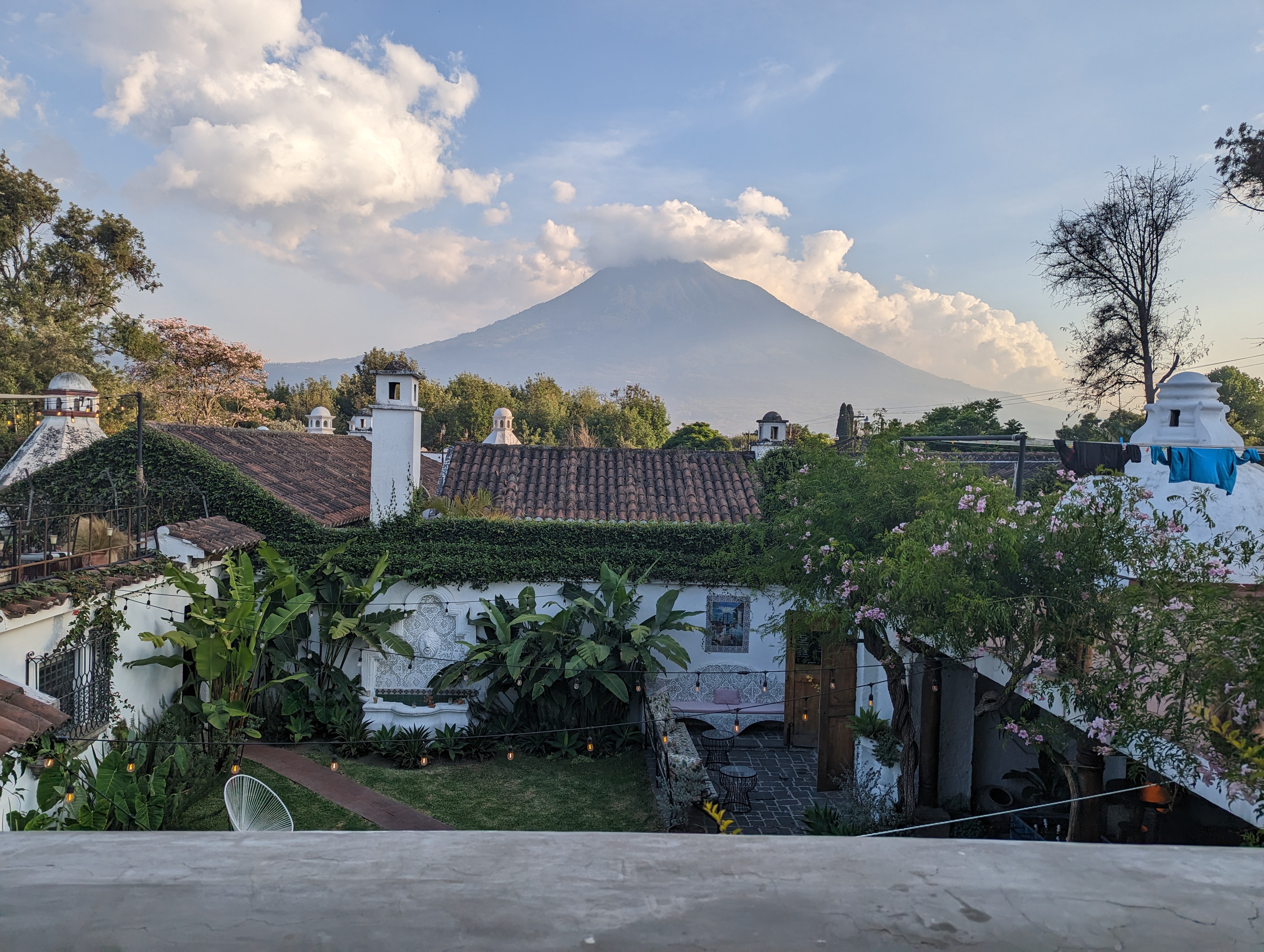 Sleeping no longer an option, we marvel as we drive pass volcanoes and mountains cut by winding rivers and canyons, all laced with little concrete towns that still manage to exude character and personality. The shuttle, which is a white sedan, begins to shake violently as the cobblestone streets welcome us at last to Antigua. Megan has chosen our hostel, a bougie affair that sports very comfortable beds, fantastic views, and a free breakfast. It also has a pool, though given that nights in Antigua are quite chilly, it is infrequently used. After checking in and getting sorted, we head out for food and our first look about town. We have breakfast right next to the hostel, what we will soon realize is the standard Guatemalan affair of refried black beans and scrambled eggs, usually with fried plantains. We then participate in what will become another standard Guatemalan affair, trying multiple ATMs until we find one that works. We spend most of the rest of day doing paperwork4 before having a dinner at a Mexican place, a third Guatemalan affair.