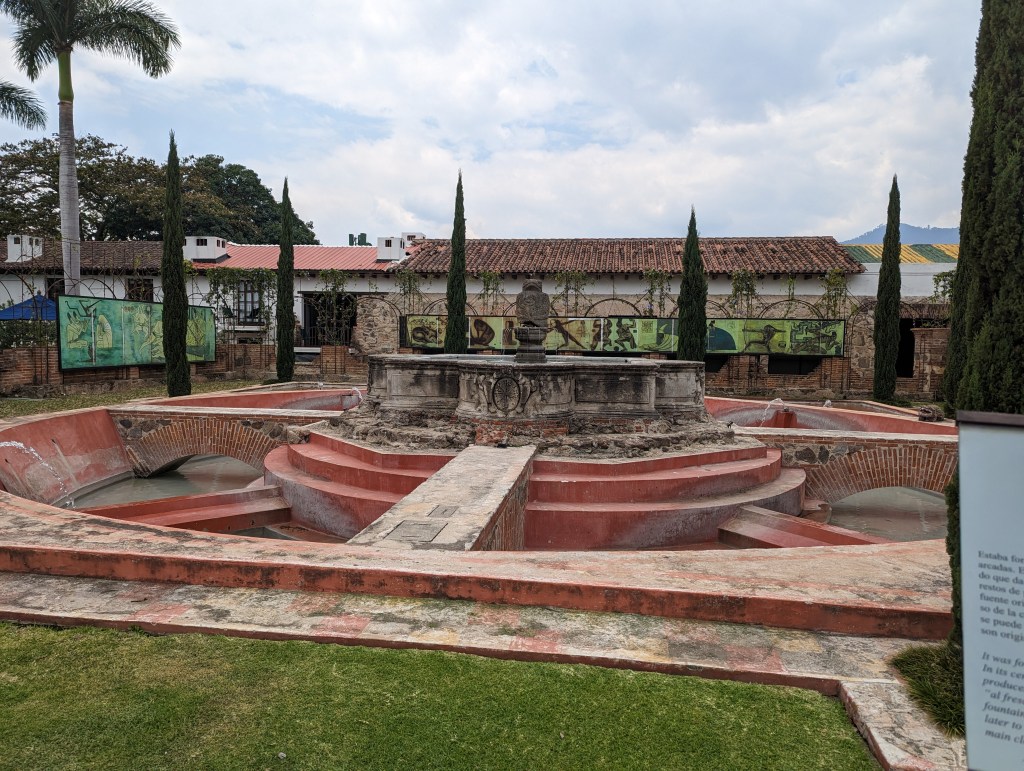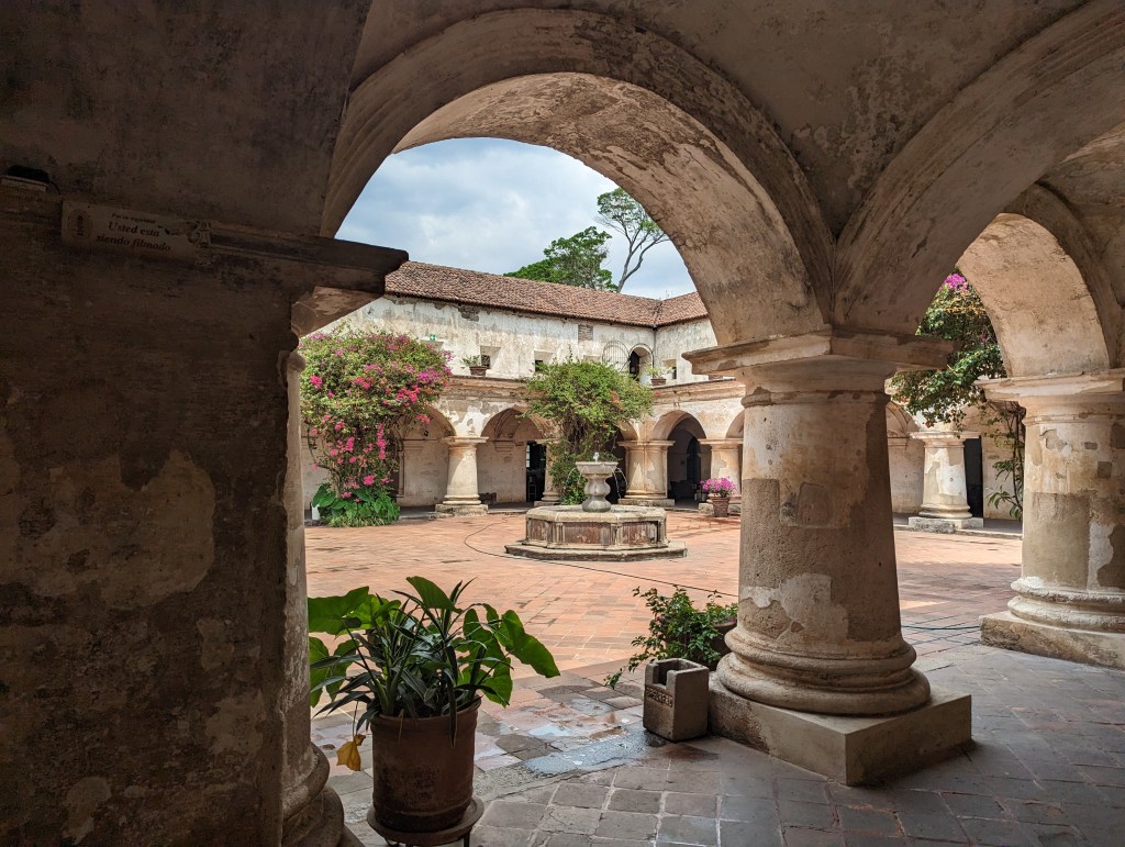 The next day is all about exploring Antigua. Antigua was founded in the 16th Century, though a series of earthquakes and other natural disasters caused the city to relocate and rebuild at least once a century. It was also once the capital of the Spanish Kingdom of Guatemala, which included at the time all of Central America minus Panama. It is replete with the remains of convents and colonial palaces, as well as the aforementioned cobblestone streets. The entire city sits in a bowl completely surrounded by mountains and volcanoes, the giant Volcan de Agua commanding attention from almost every angle. We visit the ruins of the Las Capuchinas Convent, a 16th Century complex shrouded in mystery due to the small number and secretive nature of the nuns. It is an amazing combination of the decay of time and also the timeless nature of beauty. The central courtyard squared by arched passageways demands that you sit and contemplate it. After this we head to Santo Domingo, another former convent though this one has been turned into a luxury hotel. Fully restored gardens complete with functioning fountains and scarlet macaws, along with chic restaurants and cocktail lounges blend nearly seamlessly into the crumbling ruins of the convent chapel and crypts. Inside are also numerous museums, containing everything from a collection of colonial silver to modern art. My favorite housed Mayan art and artifacts next to modern interpretations of the same subject matter. We leave after a few hours and make our way to a coffee plantation called Finca La Azotea for a tour. The walk takes 45 minutes and by the end the cobblestone streets have gone from charming to menacing. The tour is informative, but the highlight of course is the end when we get to drink some actual quality Guatemalan coffee. Afterwards we try and order a tuk tuk back but the outrageous price means one more route by feet. We settle on Italian for dinner partially because Italian is always good, but also because we feel a need to carb load. The next day we have to hike Acatenango.