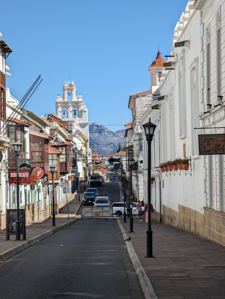 After about 7 total days we departed La Paz by night bus for Sucre. A journey that provided all the usual pleasures of night bus travel: a bus driver with a dangerous disregard for safe speeds, winding roads designed to make sure you spend some time on each side as you try to sleep, unscheduled stops so someone can board the bus and try and sell you fruit or nuts, and of course someone playing music from their phone at full volume without headphones. Restful night buses are not.
