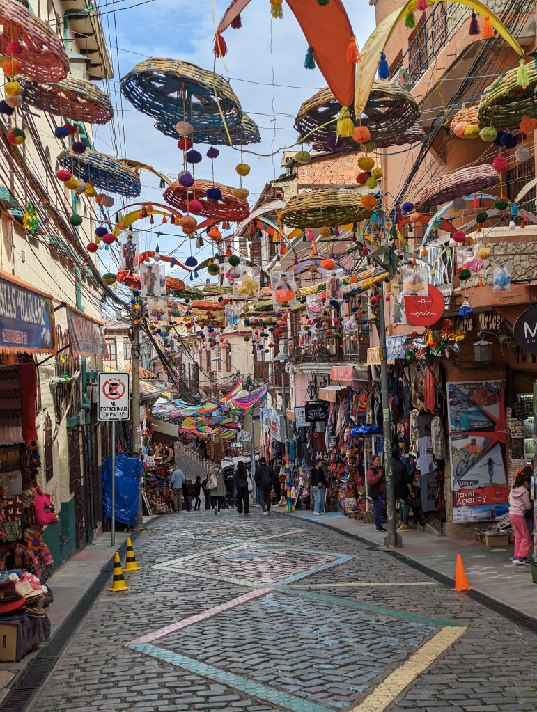 I really enjoyed La Paz. Yes the cold hostel was a daily struggle, as were the unavoidable lung busting hills you had to traverse to reach anywhere in the city. But it has a charm. It is not a city for tourists. It is place where people live and work and play. It is city where the local Aymara people are not afraid to block road access to the city to demonstrate their displeasure with a proposed new law. It is city built in the valley between mountains, where the altitude can vary by as much as 800 meters between different parts of the city, and the temperature can vary by as much as 10 degrees with the altitude. It is a dense city, with streets filled with more people than a city twice its size would have in the US.12 It has a hip district filled coffee shops and vegetarian restaurants, a business district filled with skyscrapers, and in between unending winding streets where people sell their wares beneath blue tarps in the streets. It is city that really loves dogs, and really likes dressing them up.13 And at all times, at all hours, it is a safe city. Assuming you don’t collapse from lack of oxygen.